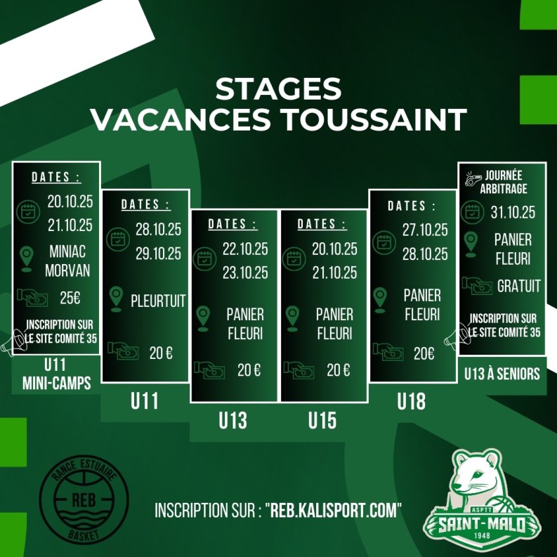 Les vacances approchent et avec elles, de belles opportunités pour progresser, partager et s’amuser autour du basket. L’ASPTT Saint-Malo vous propose, en partenariat avec le comité et le REB, plusieurs stages pour toutes les catégories, du U11 au U18.